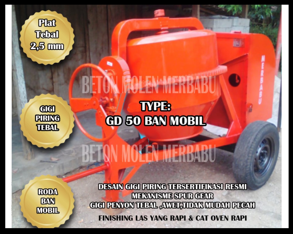 Selain itu, spesifikasi produk yang terbuat dari plat besi tebal 2,5 mm menjadikan bodi beton molen ini kuat terhadap benturan beton. Kelebihan lain dari produk ini adalah gigi piring dan gigi penyongnya yang sangat tebal 4 cm dan desainnya tidak ditemukan dalam produk sejenis.