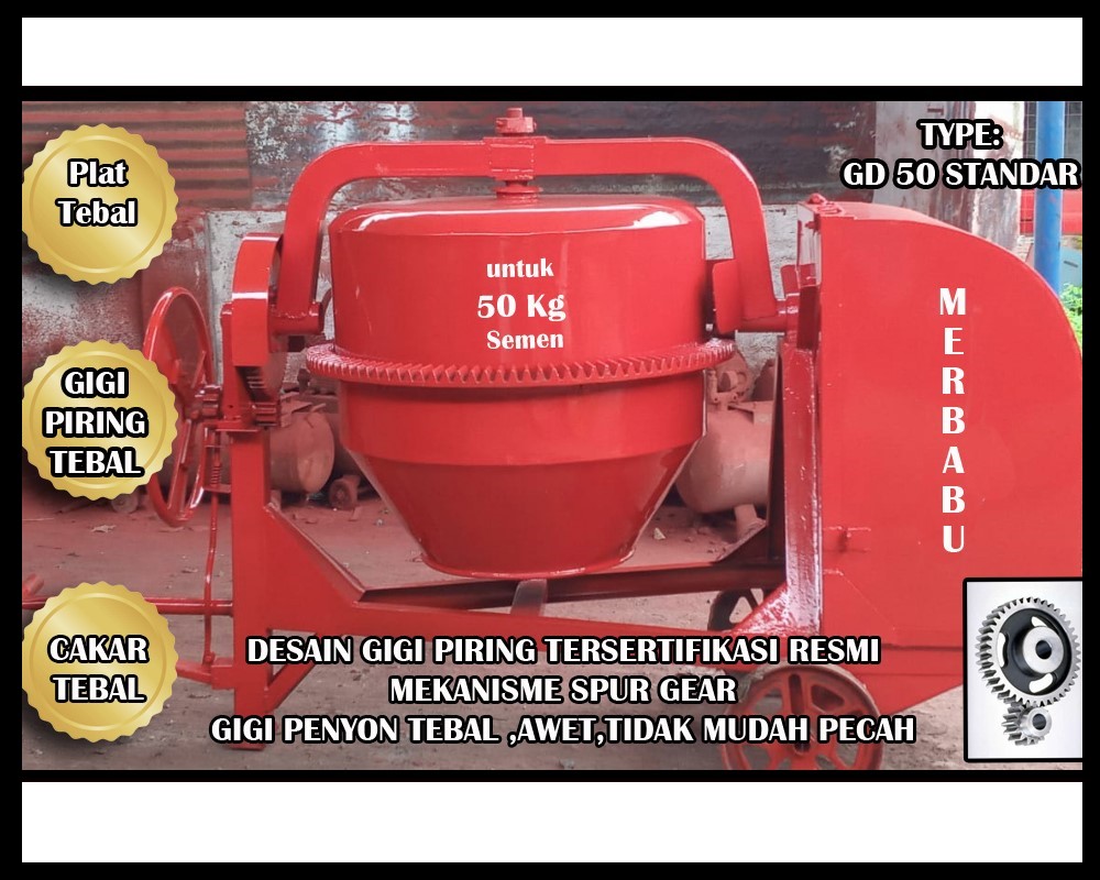 Molen Beton Merbabu tipe GD50 adalah produk yang sangat cocok untuk kebutuhan pembuatan beton dalam skala besar. Dengan kapasitas 385 liter (50 Kg semen), produk ini mampu mengaduk hingga 550 Kg campuran beton dalam satu kali isi.