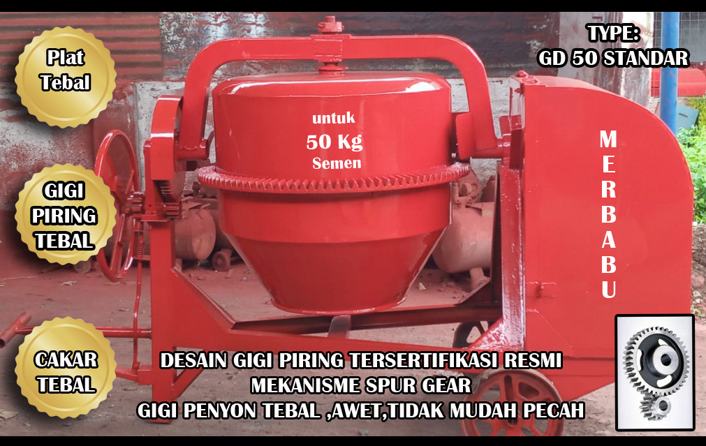 Molen Beton Merbabu tipe GD50 adalah produk yang sangat cocok untuk kebutuhan pembuatan beton dalam skala besar. Dengan kapasitas 385 liter (50 Kg semen), produk ini mampu mengaduk hingga 550 Kg campuran beton dalam satu kali isi.